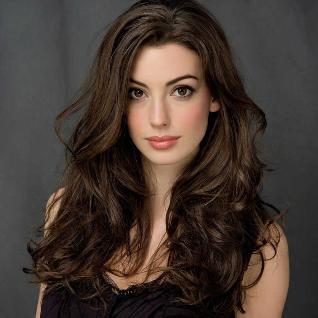 Anne Hathaway’s long layered hairstyle proves that thin hair doesn’t have to be short to look voluminous. The cascading layers add movement, and the slightly curled ends give a full, luxurious finish.