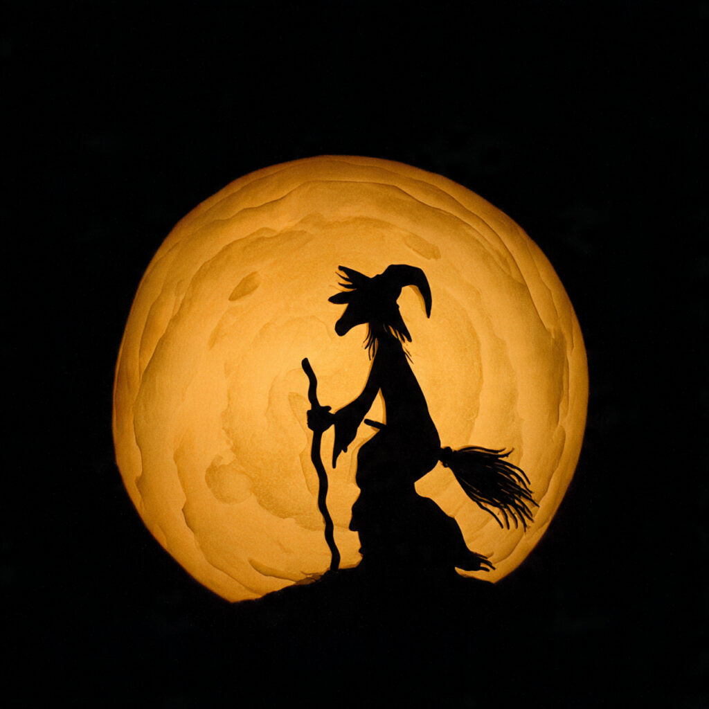 For a whimsical twist, carve a witch flying on her broom across a glowing moon background.